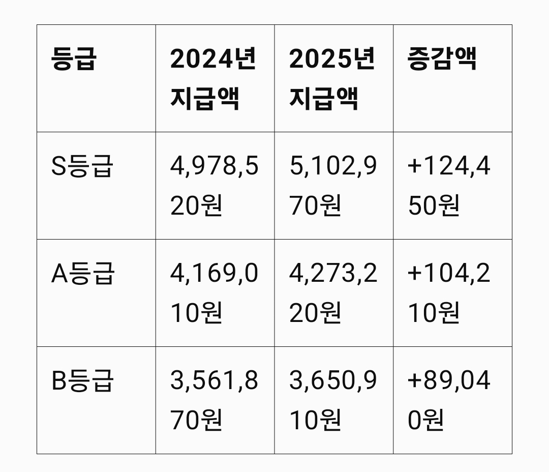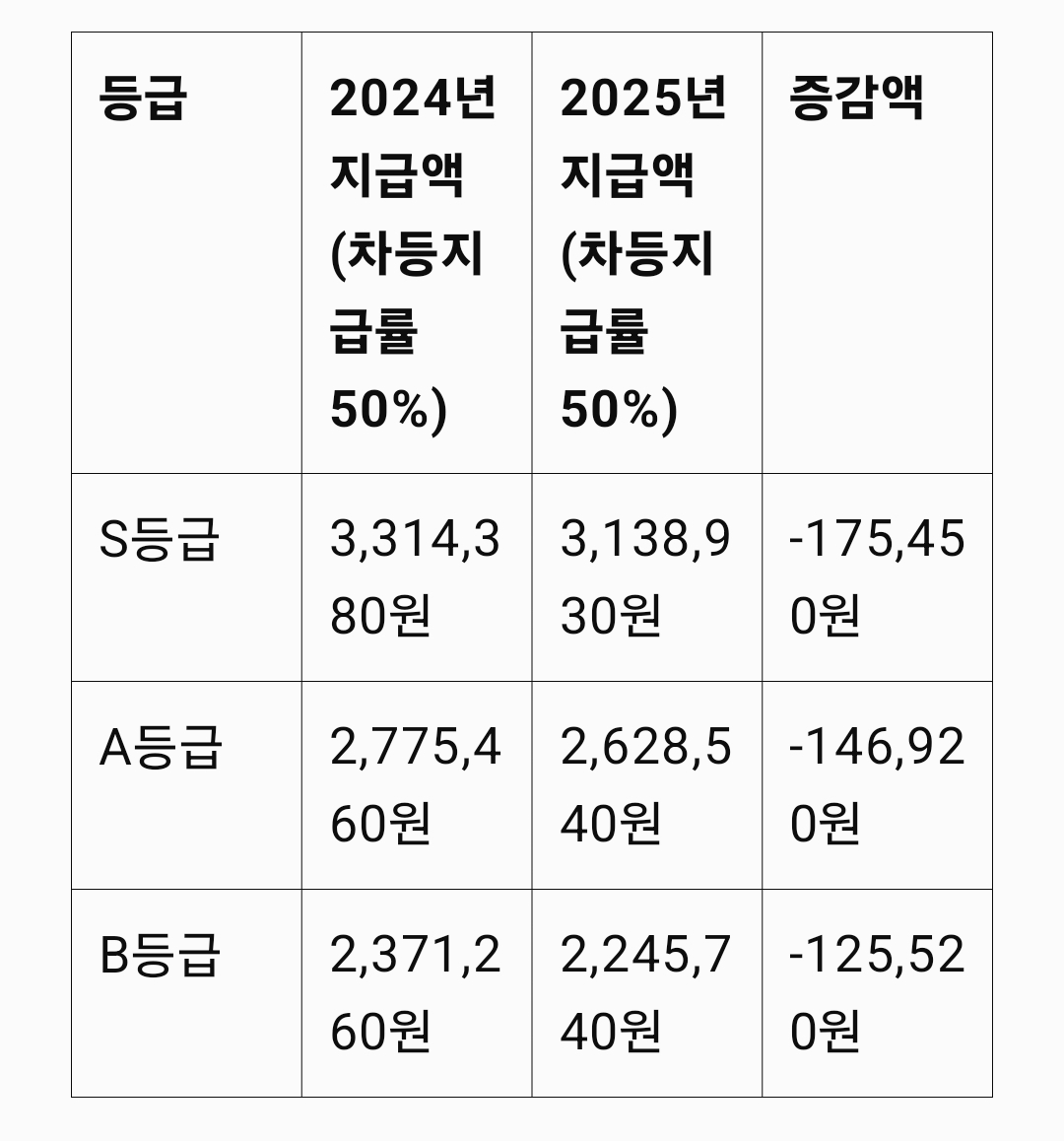 차등지급률이 50% 기준일 때, S등급은 약 17만 5천 원 감소했으며, A등급과 B등급 또한 각각 14만 6천 원, 12만 5천 원이 줄어들었습니다. 이는 교육부의 예산 조정과 지급 기준 변화에 따른 결과로 해석됩니다.